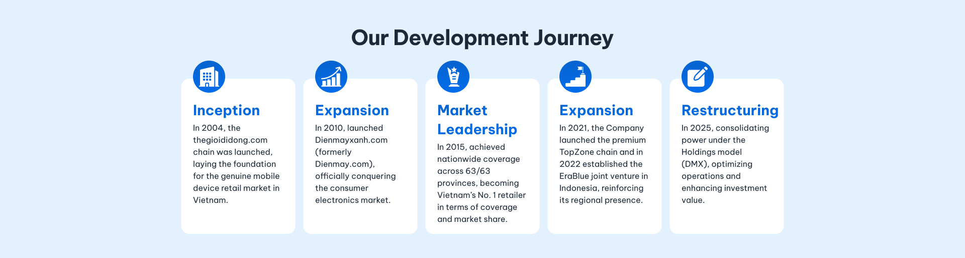 DMX is honored to be part of the diversified retail ecosystem of Mobile World Group (MWG). Beyond our core strength in technology and consumer electronics, the Group affirms its leadership in essential sectors including food, pharmaceuticals, mother & baby, and maintenance services. The synergy of financial resources and management expertise from Vietnam's leading corporation ensures DMX's sustainable growth.